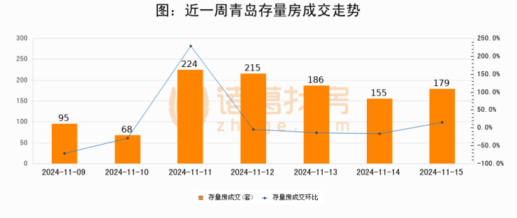 从存量房来看,2024年11月15日青岛存量房单日成交179套,比昨日增加24套,环比上涨15.5%。从近一周存量房成交来看,青岛存量房日均成交套数为160套,11月15日单日成交179套,高于近一周平均水平11.9%。