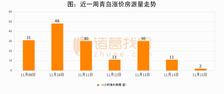 根据诸葛找房数据显示,青岛24小时涨价房源量为2套,较11月14日减少9套,环比下降81.8%。与此同时,涨价房源占比小幅回落,对于购房者来说是一个入市窗口期,购房者可抓住时机入市。