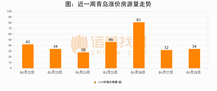 根据诸葛找房数据显示,青岛24小时涨价房源量为34套,较04月27日增加2套,环比上涨6.2%。与此同时,涨价房源占比小幅扩大,业主信心有所提升。