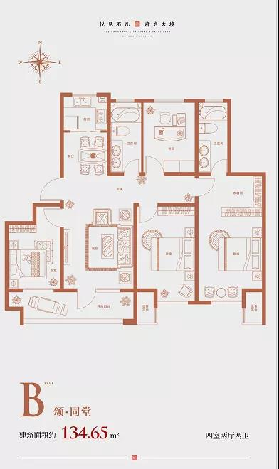 建面约134㎡四室两厅两卫户型,较大的亮点就是区域内非常稀缺的三南卧南厅的四南向空间,不管是三代同堂还是二孩家庭,都能充分享受充足的南向采光空间。优质的布局甚至使它拥有了甚至能比肩约150㎡的空间尺度感。