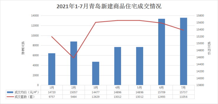 根据卓易数据显示,青岛7月份新建商品房和新建商品住宅成交方面均迎来环比下降,仅有新建商品住宅的成交均价略有升高,为15737元/㎡。