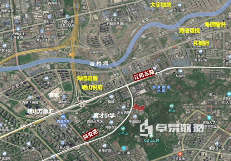 地块位于崂山核心区,靠近崂山万象汇、宜家等商业配套;紧邻崂山最好的学区育才中学;周边有金岭山自然山景,南侧500米约为张村河生态公园,且短时间可达石老人前海配套等,各项配套方便可达。