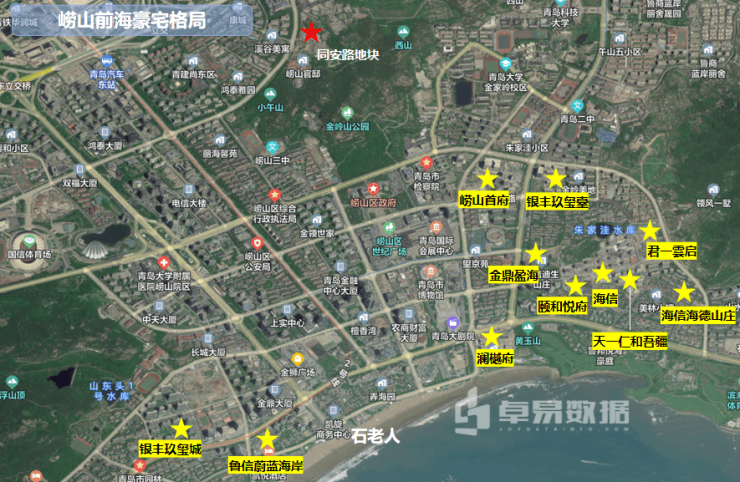 地块南侧片区的瞰海一线包含金家岭的崂山首府、银丰玖玺臺、金鼎盈海等,而再往南的天一仁和吾疆、澜樾府、颐和悦府(原地王柏悦府)、新项目君一雲启(预计4月中旬开放会客厅,5月初开放示范区与样板间)和海信王家村、银丰玖玺城以及鲁信蔚蓝海岸等,但并不形成强竞争关系。