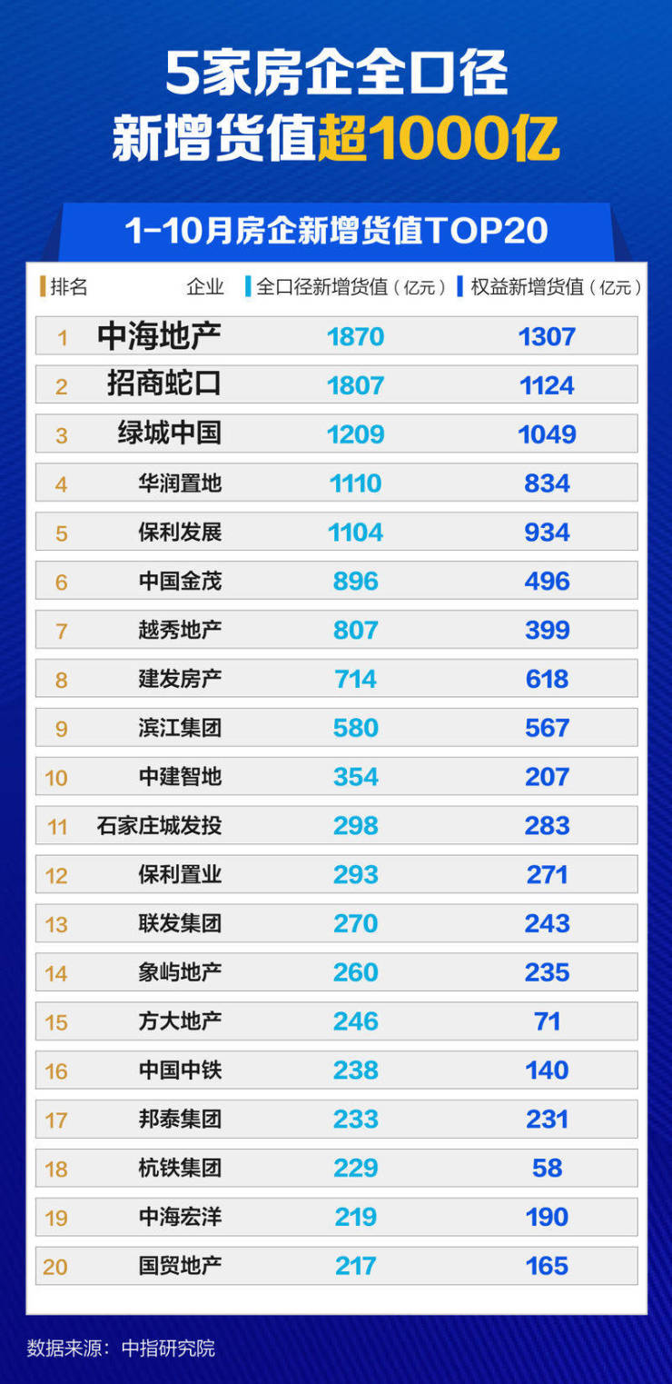 从新增货值来看,1-10月,中海、招商和绿城位列前三。其中,中海以1870亿元新增货值位列第一,招商、绿城新增货值规模分别为1807亿元和1209亿元,分列第二和第三位。而在1-9月的排名中,前三位为绿城、保利发展和中海。