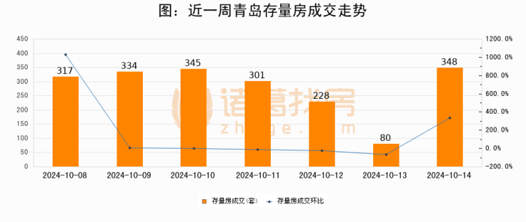 从存量房来看,2024年10月14日青岛存量房单日成交348套,比昨日增加268套,环比上涨335%。从近一周存量房成交来看,青岛存量房日均成交套数为279套,10月14日单日成交348套,高于近一周平均水平24.7%。