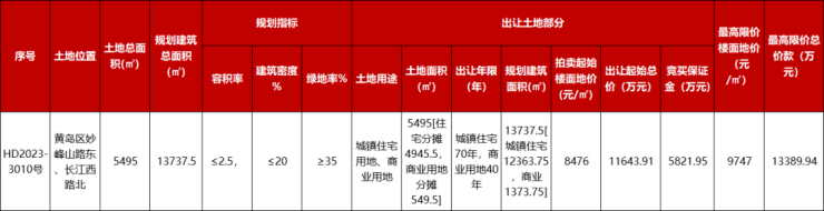 5月31日,2023年青岛第一批次最后一块黄岛中心城区长江西路北地块拍卖,最后由青城集团获得,楼面价8476元/㎡,总价1.16亿。