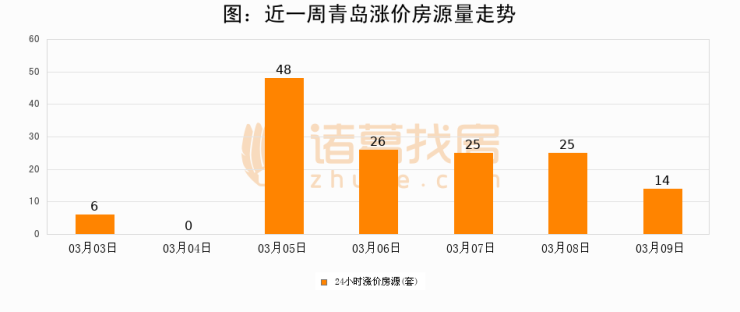 根据诸葛找房数据显示,青岛24小时涨价房源量为14套,较03月08日减少11套,环比下降44%。与此同时,涨价房源占比小幅回落,对于购房者来说是一个入市窗口期,购房者可抓住时机入市。