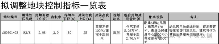 根据调整方案,地块原为中小学用地以及商业用地调整为商住用地,调整后地块占地2.98万㎡,容积率2.9,总建面8.64万㎡,其中住宅建面不超过5.26万㎡,商服不超过2.76万㎡,商住比34:64,配建幼儿园及托育所470㎡、健身中心2000㎡,养老服务站600㎡。