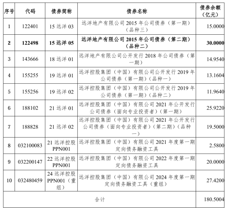 8月18日,远洋方面公布境内债务重组方案,对标的债券本金和利息偿付安排作出调整,并提供现金购回、股票经济收益权、资产抵债等多种清偿选项。重组包括7笔公司债和3笔PPN,本金额合计180.5亿元。
