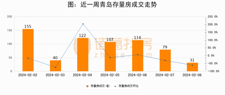 从存量房来看,2024年02月08日青岛存量房单日成交31套,比昨日减少48套,环比下降60.8%。从近一周存量房成交来看,青岛存量房日均成交套数为92套,02月08日单日成交31套,低于近一周平均水平66.3%。