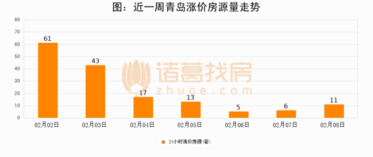 根据诸葛找房数据显示,青岛24小时涨价房源量为11套,较02月07日增加5套,环比上涨83.3%。与此同时,涨价房源占比小幅扩大,业主信心有所提升。