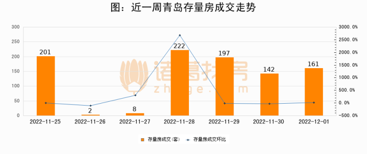 从存量房来看,2022年12月01日青岛存量房单日成交161套,比昨日增加19套,环比上涨13.4%。从近一周存量房成交来看,青岛存量房日均成交套数为133套,其中11月28日成交量最高为222套,12月01日单日成交161套,高于近一周平均水平21.1%。