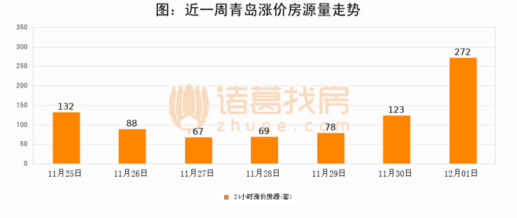 根据诸葛找房数据显示,青岛24小时涨价房源量为272套,较11月30日增加149套,环比上涨121.1%。与此同时,涨价房源占比小幅扩大,业主信心有所提升。