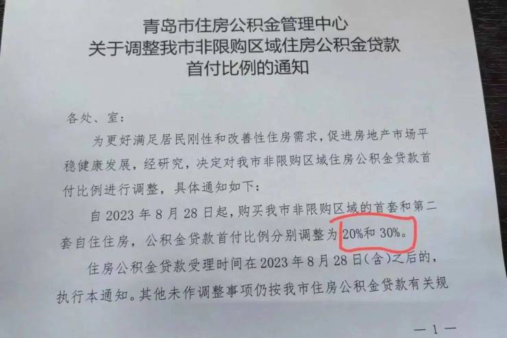 青岛出台公积金新政:公积金贷款首套首付20%!二套首付30%!