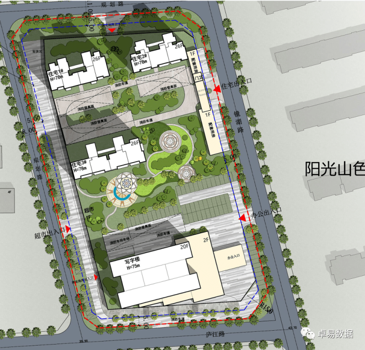 根据规划方案将建设3栋26F住宅高层+1栋20F写字楼。