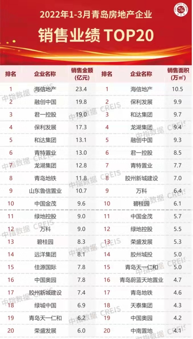 匠心筑就品质,带来的是无数客户的认可。从《2022年1-3月青岛房地产企业》销售业绩TOP榜来看,不出意外,海信地产分别在销售金额榜和销售面积榜摘得冠军。