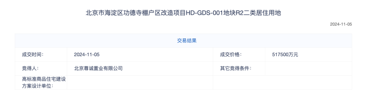 该地块吸引多家房企争夺。中指研究院监测数据显示,该地块共吸引了越秀、华润、中海、金茂、海开&建工、绿城共6家竞买人参与竞拍,开拍后经过35轮竞价触达地价上限,转入摇号环节,越秀、华润、中海、金茂、绿城5家竞买人确认参加摇号,最终由绿城旗下北京尊诚置业有限公司摇中该地块,成交总价51.75亿元,成交楼面价71061元/平方米,溢价率15%,该地块销售指导价10.5万元/平方米(±8%)。