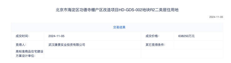 此外,当日出让的另一宗地块为京土储挂(通)[2024]042号即通州区土桥中路西侧棚户区改造项目FZX-0202-6025地块,该地块土地面积21536.095平方米,规划建筑面积47379.409平方米,用地性质为R2二类居住用地。根据成交结果,该地块以底价成交,竞得人为北京金隅嘉业房地产开发有限公司,成交价格为11.96亿元。