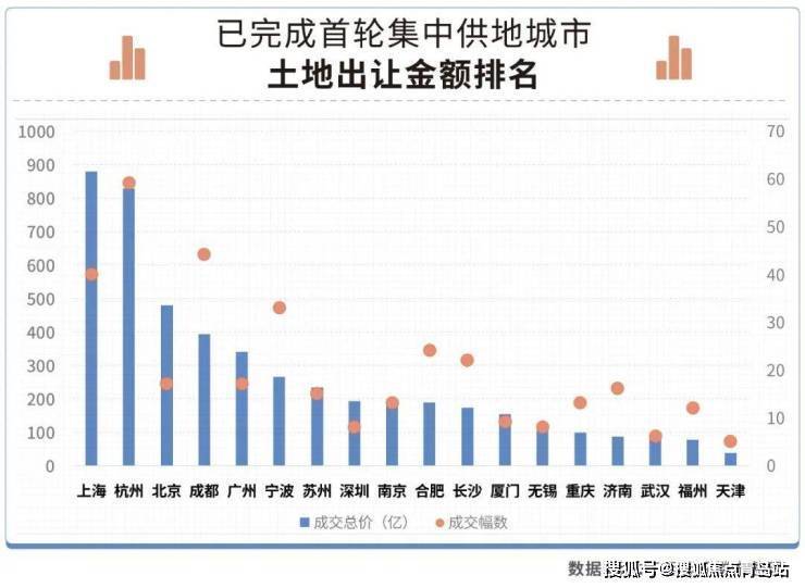 以深圳为例,深圳首批集中供地“量少价高”,加上深圳本来土地供不应求,这次所推出的8宗住宅用地竞价全部“触顶”、揽金193亿元,整体溢价率高达约15%。而“量大价优”的杭州土拍历来备受关注,在其他城市削减供地数量时,杭州首批供地就推出60宗地块,最终仅1宗流拍,总成交价826.8亿元,溢价率6.4%,成交宗数和成交总建面均居20城首位。