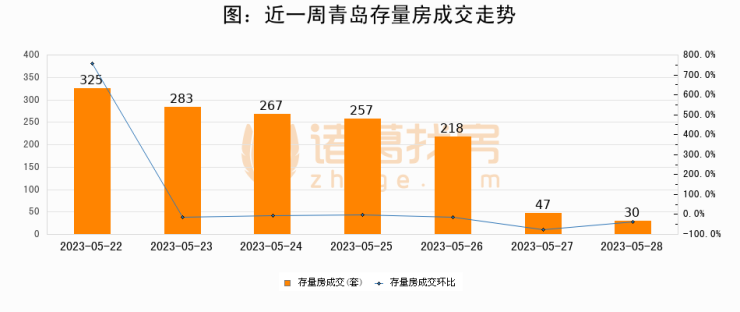 从存量房来看,2023年05月28日青岛存量房单日成交30套,比昨日减少17套,环比下降36.2%。从近一周存量房成交来看,青岛存量房日均成交套数为203套,05月28日单日成交30套,低于近一周平均水平85.2%。