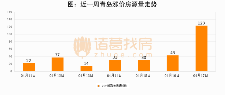 根据诸葛找房数据显示,青岛24小时涨价房源量为123套,较04月16日增加80套,环比上涨186%。与此同时,涨价房源占比小幅扩大,业主信心有所提升。