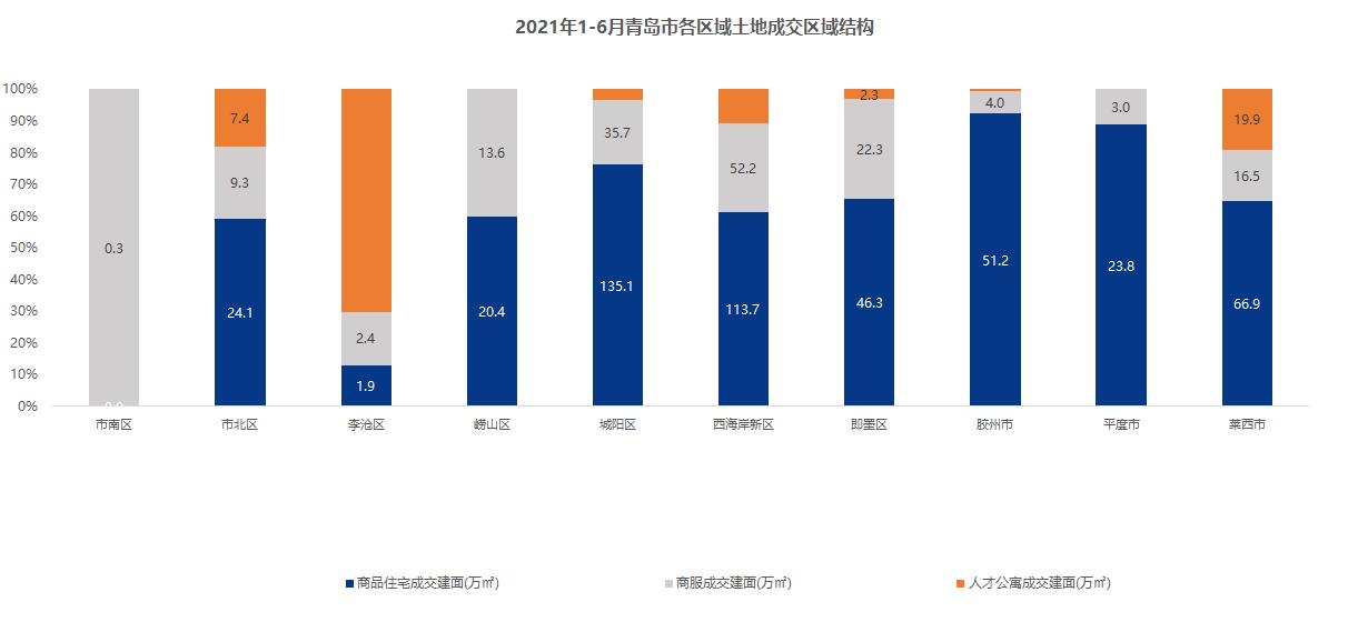 成交面积方面,西海岸新区成交面积186万㎡夺冠、城阳区成交面积174.35万㎡、即墨区成交面积119.45万㎡、莱西市成交面积也突破百万平米,这些区域成交均位居前列。
