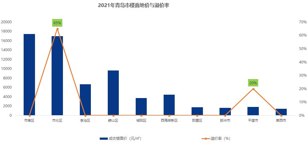 成交楼面价方面,市南区、市北区位居前列,分别是17417元/㎡、12745元/㎡,崂山区、市北区、李沧区紧随其后。