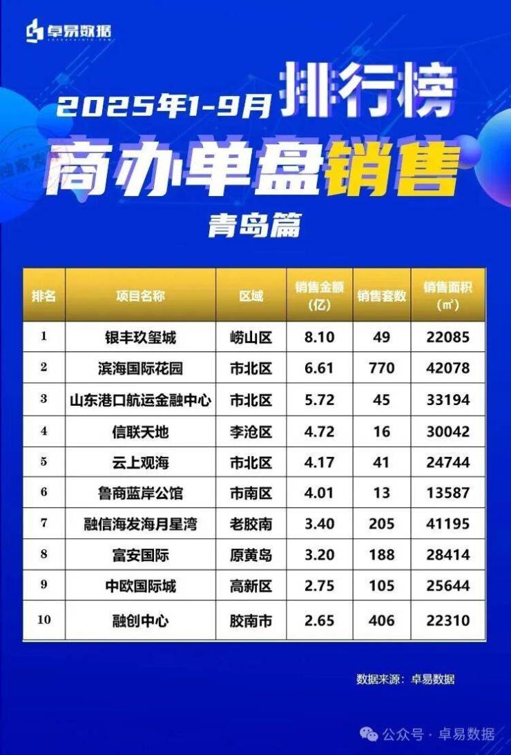 商办市场中,第一的银丰玖玺城8.10亿、滨海国际花园6.61亿、山东港口航运金融中心5.72亿。