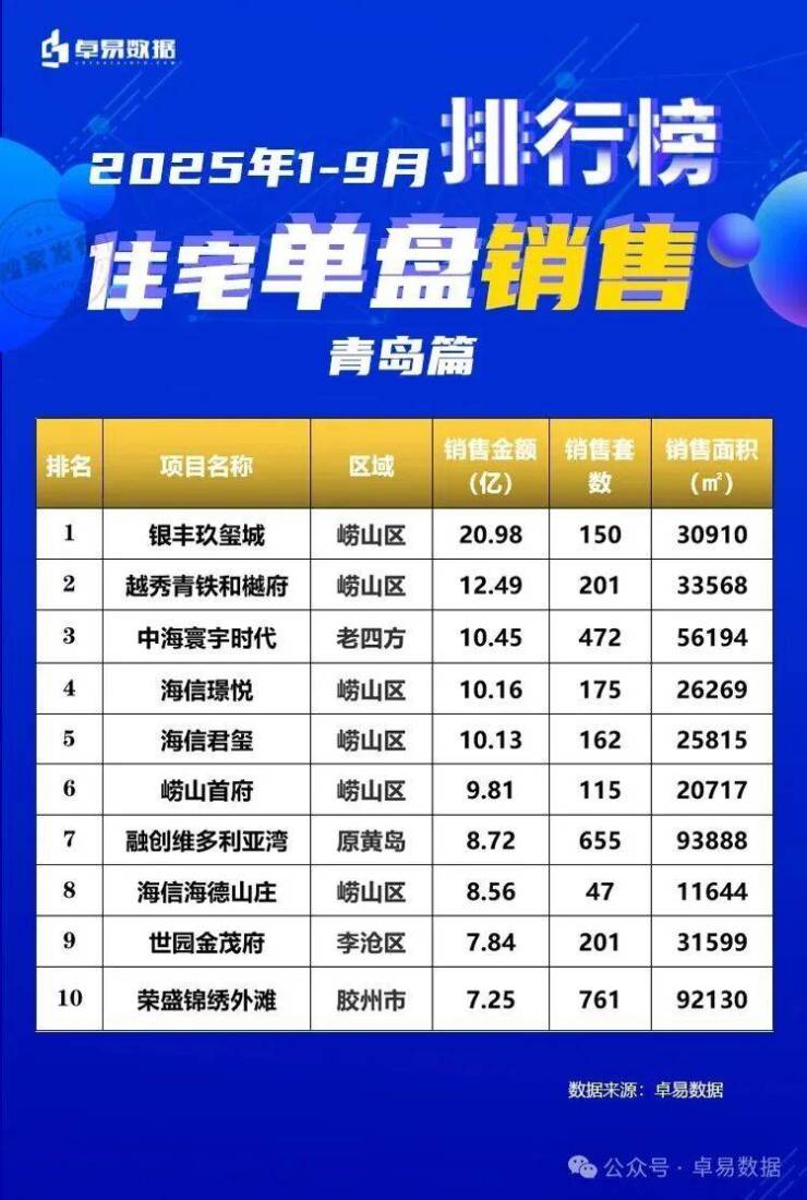 在新建住宅市场中,TOP5有四个位于崂山,崂山市场份额提升明显。2025年前9个月第一的银丰玖玺城签约20.98亿;第二的越秀青铁和樾府12.49亿;第三的中海寰宇时代10.45亿。