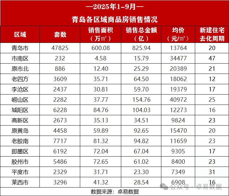 2025年截至到9月,青岛新建商品房签约47825套(退房已剔除,以下同),成交600.08万㎡,成交总价825.94亿;签约套数、面积和签约金额同比去年下降4.64%、3.39%和5.04%;二手房成交套50584套(住宅47809套),二手房交易量与新房基本持平。青岛新房、二手房2025年1-9月合计成交约9.8万套。