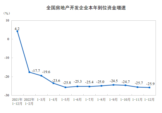 2022年,房地产开发企业到位资金148979亿元,比上年下降25.9%。其中,国内贷款17388亿元,下降25.4%;利用外资78亿元,下降27.4%;自筹资金52940亿元,下降19.1%;定金及预收款49289亿元,下降33.3%;个人按揭贷款23815亿元,下降26.5%。