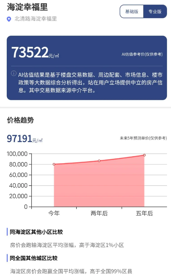 每经AI品房小程序专业版显示,未来五年,海淀幸福里价格有望达到9.7万元/平方米,涨幅将高于海淀区1%小区,将跑赢全国平均涨幅,高于全国99%区县。