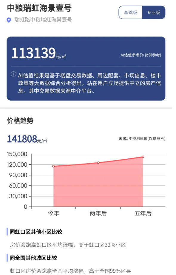 每经AI品房小程序专业版预测,未来五年中粮瑞虹海景壹号的价格有望达到141808元/平方米,涨幅将跑赢虹口区平均涨幅,高于全国99%区县。