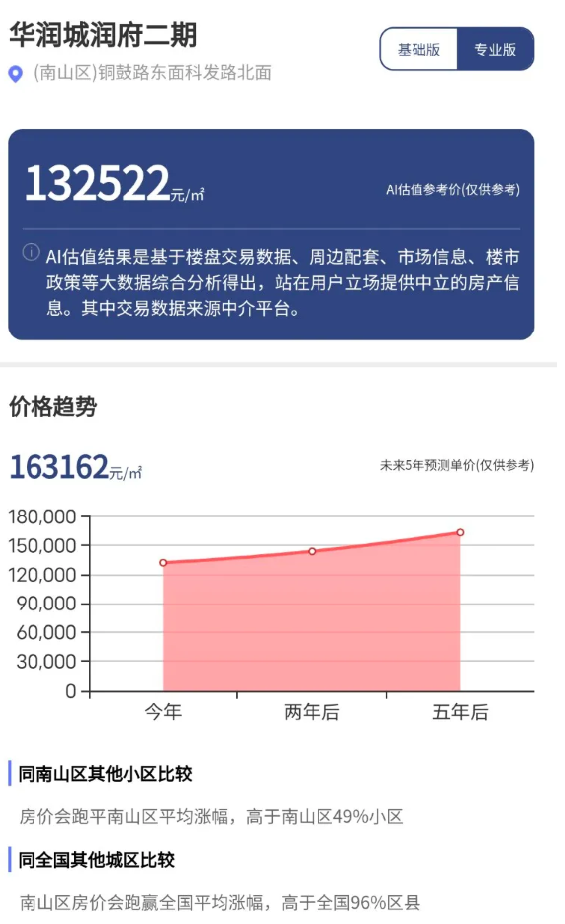 据每经AI品房小程序专业版显示,未来五年华润城润府二期的价格有望达到163162元/平方米,将跑平南山区近五成住宅小区,同时将超过全国房价平均涨幅,高于全国96%区县。