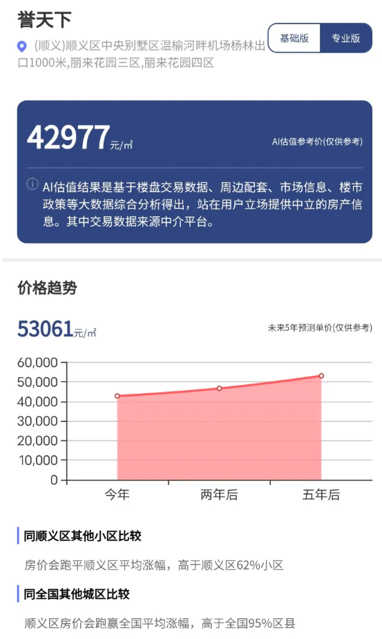 第三方平台显示,誉天下项目的二手房价格为45927 元/平方米。每经AI品房小程序显示,目前誉天下的估值参考价为42977元/平方米,未来五年的价格有望达到53061元/平方米。