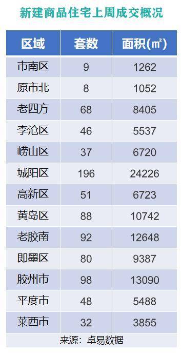 从各区成交情况来看,上周城阳区新建商品住宅以成交面积24226㎡的成绩,位列上周各片区新建商品住宅成交面积榜首位;胶州市以成交面积13090㎡的成绩,位列成交面积榜第二位;原胶南市以成交面积12648㎡的成绩,位列成交面积榜第三位。