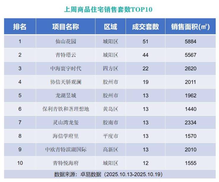 从各项目成交套数来看,位于城阳区的仙山花园以成交51套的成绩列榜单首位;位于城阳区的青特璟云以成交44套成绩上榜第二位;位于市北区的中海寰宇时代以成交22套的成绩列榜单第三位。