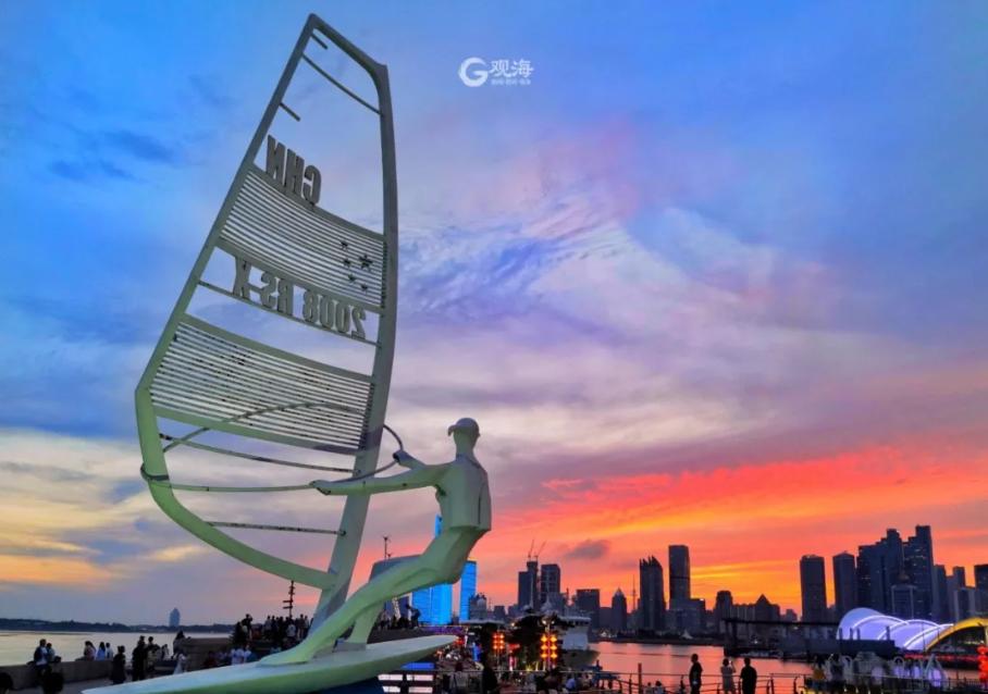 注:▲帆板雕塑与天空的晚霞交相映衬。观海摄影师 崔超摄
