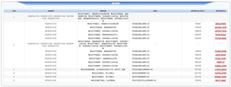 11月21日上午,黄岛区14幅地块在网上进行国有土地使用权拍卖,土地总面积为1282351.05平方米,规划总面积1508265.61平方米。最终,HD2018-3127、HD2018-3128、HD2018-3129、HD2018-3130、HD2018-3131地块被青岛青岛隆岳置业有限公司 以底价竞得,成交价41644.4884万元;HD2018-3132、HD2018-3133、HD2018-3134、HD2018-3135、HD2018-3136地块被青岛青岛隆岳置业有限公司以底价竞得,成交价74856.0328万元;HD2018-3138地块被青岛青岛英创建设发展有限公司 以底价竞得,成交价11013.8034万元;HD2018-3139地块被青岛 富双投资管理有限公司以底价竞得,成交价16193.2705万元;HD2018-3140地块被青岛 富双投资管理有限公司以底价竞得,成交价65862.5292万元;HD2018-3141地块被青岛青岛中农现代农业发展有限公司以底价竞得,成交价9013.3862万元;总成交金额达到218583.5105万元。