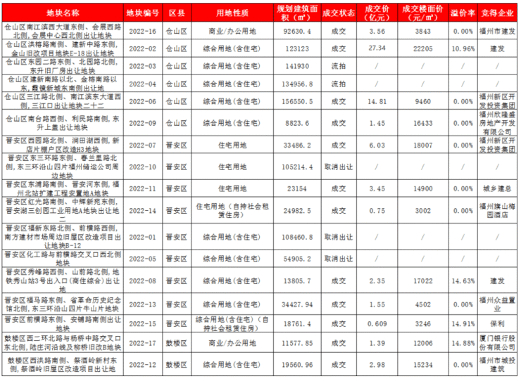 4幅溢价成交的地块中,3幅为涉宅用地。2022-08地块为晋安区秀峰路西侧、山前路北侧,地铁秀山站3号出入口(商住综合)出让地,该地块最终以总价2.35亿元(溢价率14.63%),成交楼面价17022元/平方米的价格,由厦门国企建发集团摇号竞得。