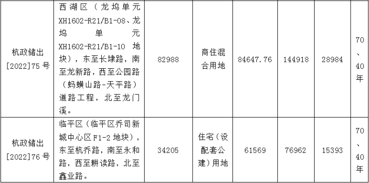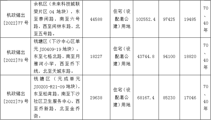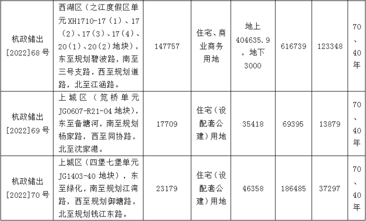 具体来看,9宗地块中,起始价较高的地块为杭政储出[2022]62号地块,该地块位于拱墅区(庆隆小河单元GS0305-R21-01地块、GS0305-G1-27地块),东至学院北路,南至规划沁园路,西至登云路,北至登云路。按照出让公告,地块出让面积83785平方米,地块用途为住宅(设配套公建)用地、公园绿地;地块起始价63.57亿元。