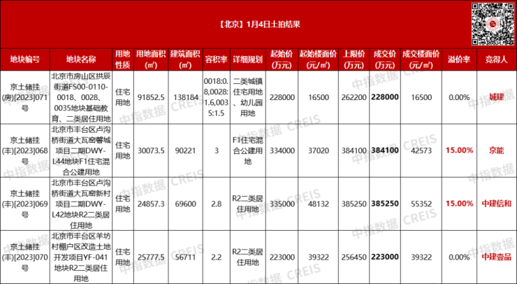 1月4日,北京迎来2024年首场土地出让。此次共计出让4宗商品住宅用地,2宗丰台区大瓦窑新村地块均以地价上限价格成交,丰台区羊坊村棚户区改造项目地块和房山区拱辰街道地块均以底价成交,共计揽金122.03亿元。