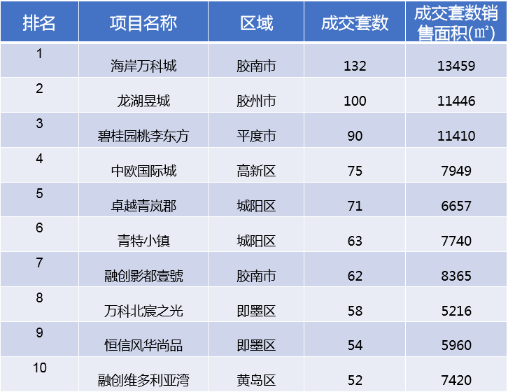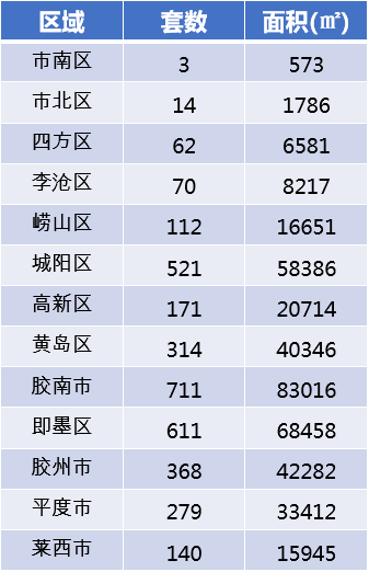 从各区成交情况来看,上周胶南市新建商品住宅成交711套,成交面积为83016㎡,位列上周各片区新建商品住宅成交面积和成交套数首位;即墨区以成交611套,成交面积68458㎡的成绩名列第二;城阳区以单周成交521套,成交面积58386㎡列第三位;