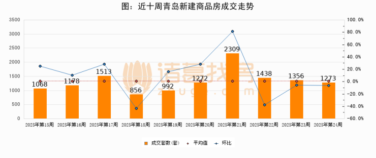 进入2025年第24周(06月09日-06月15日),青岛新建商品房成交1273套,较上周减少83套,环比下降6.1%
