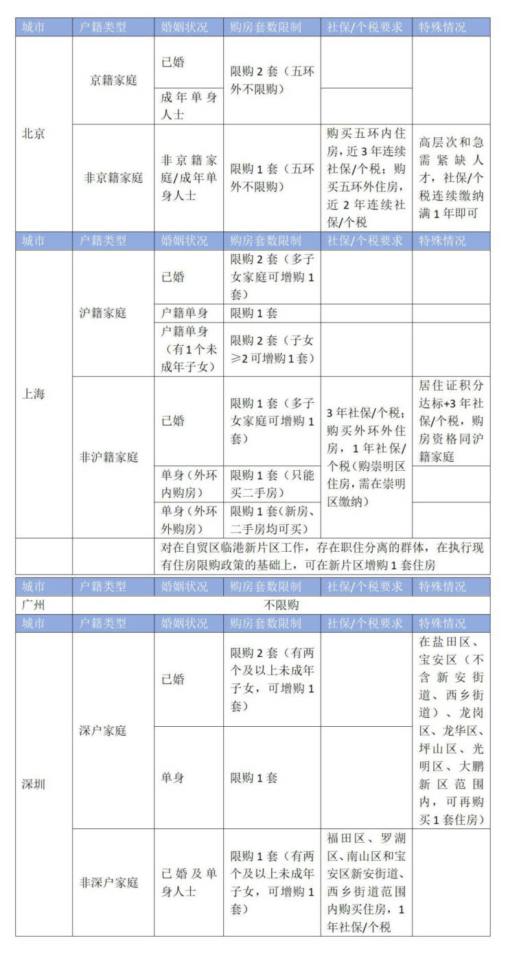 居民家庭购买五环内商品住房的政策不变,京籍居民家庭五环内限购2套,在北京市连续缴纳社会保险或个人所得税满3年及以上的非京籍居民家庭五环内限购1套。