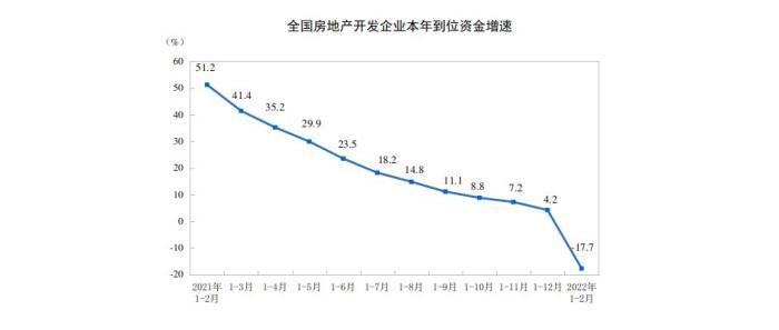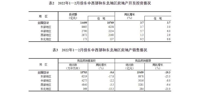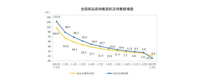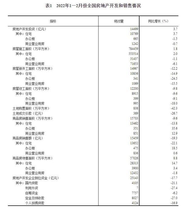 1—2月份,商品房销售面积15703万平方米,同比下降9.6%,其中,住宅销售面积下降13.8%;商品房销售额15459亿元,下降19.3%,其中,住宅销售额下降22.1%。