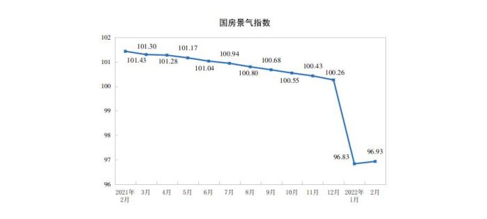 2月份,房地产开发景气指数(简称“国房景气指数”)为96.93。