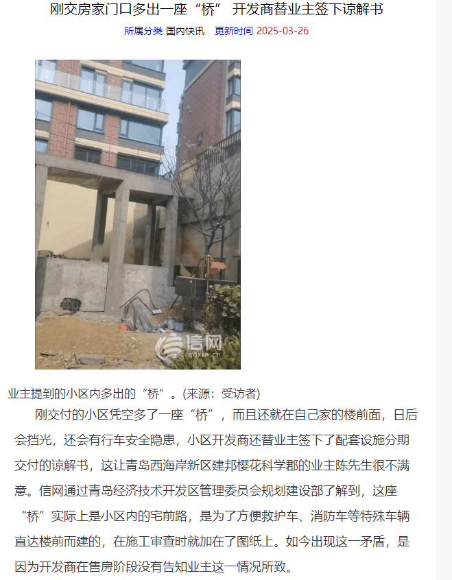 《刚交房家门口多出一座“桥”》——青岛西海岸建邦樱花科学珺的交付“变脸”引来媒体报道,更离谱的是,围绕着这座“桥”的谅解书也有开发商代签嫌疑。
