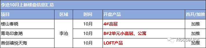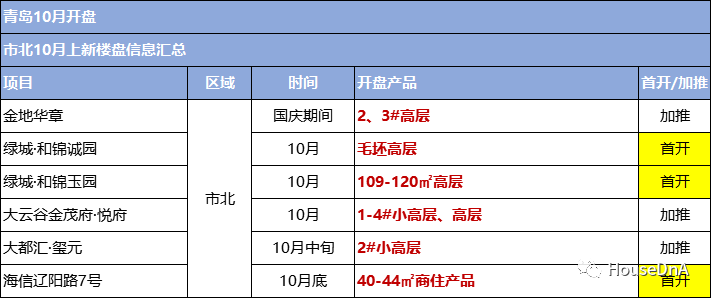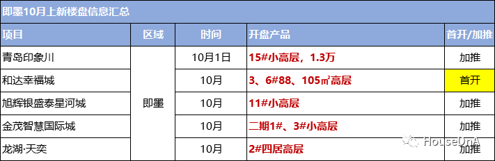 即墨是当下青岛楼市中新房库存量大区之一,且存在去化困难,同质化严重等问题,十月份仅有5盘计划推量,位于白云山畔两区交界的和达新盘幸福城,原定于中秋入市,推迟到十月首次入市两栋88、105㎡高层,均价9500-9800元/㎡。另外,加推盘中,蓝谷的印象川十月一当天加推一栋小高层均价13000元;汽车新城板块的星河城同样上新小高层产品;近7号线烟青路上金茂智慧国际城也将计划入市小高层;城西的改善大盘龙湖天奕则将加推一栋高层。