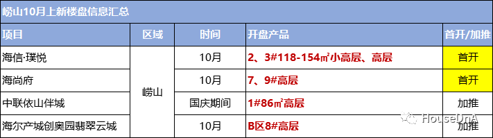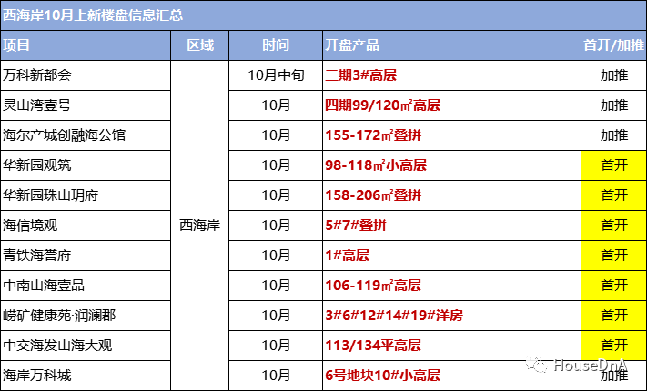 十月,西海岸新盘混战,七个新盘集中入市,多业态住宅产品抢客户。润澜郡一次性推出五栋洋房,华新园观筑则首推98-118㎡小高层,青铁海誉府、中南山海壹品和中交海发山海大观都将推出高层产品,华新园珠山玥府和海信境观计划入市叠拼产品。